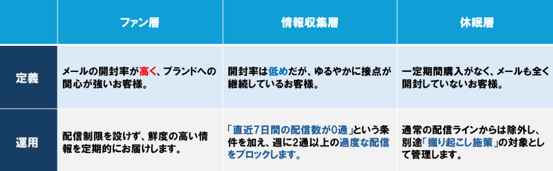 顧客のメール開封実績や購入履歴をもとに、配信対象を以下の3つのグループに分類することで、最適な配信頻度をコントロールしていきましょう。