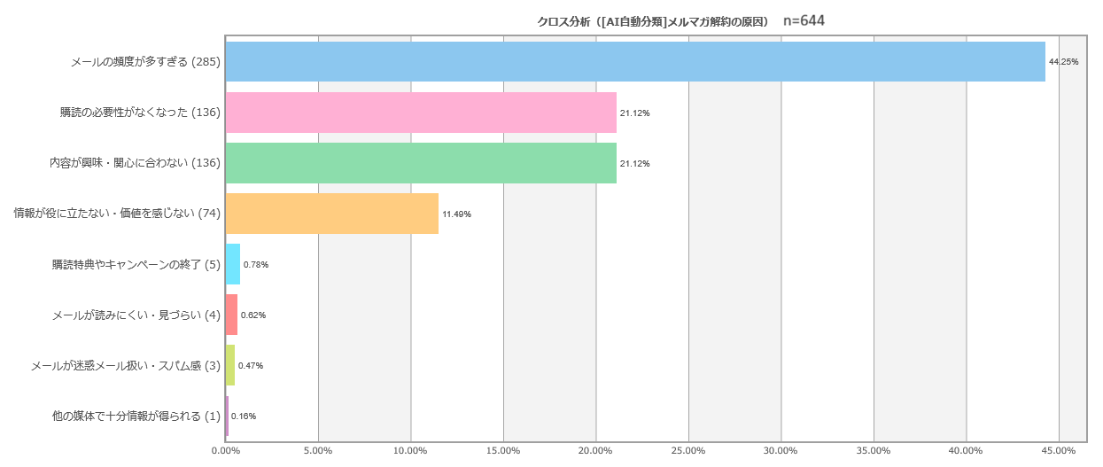 配信頻度が多すぎる場合には、読み切れなくなり「うっとうしい」「面倒」といった負担感につながり、購読解除の明確な動機となっています。