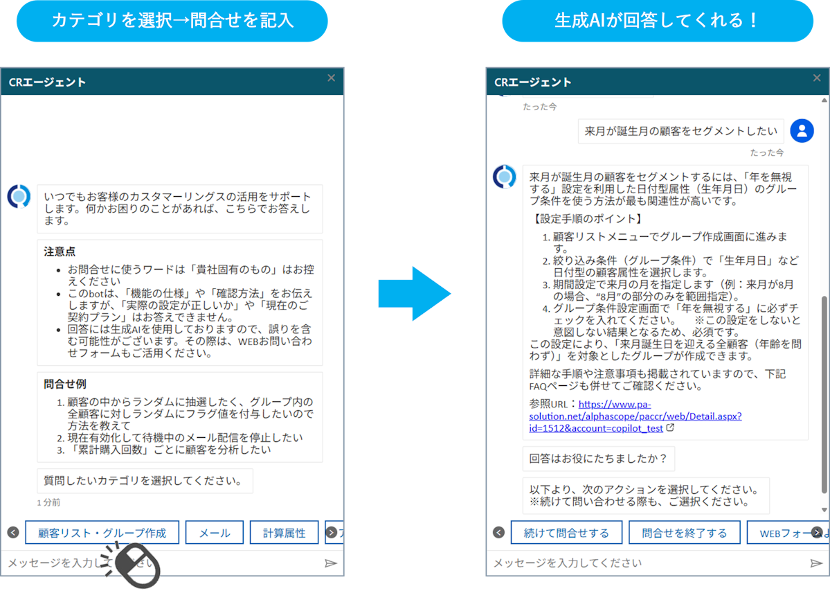 本機能は、カスタマーリングスのよくある質問(FAQ)のデータを元に、生成AIが回答を作成します。