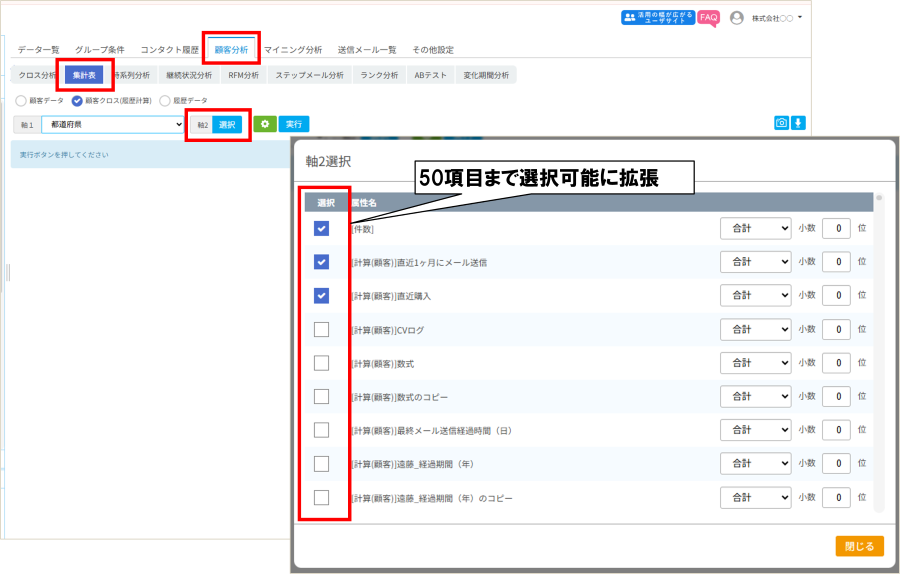 3.集計表の顧客クロス(履歴計算)にて軸2に選択できる項目数を50個まで拡張