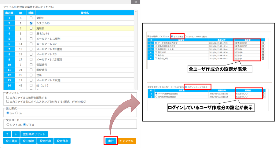 機能:顧客リストメニュー>データ一覧>顧客データ よりデータエクスポートをする際の設定について、