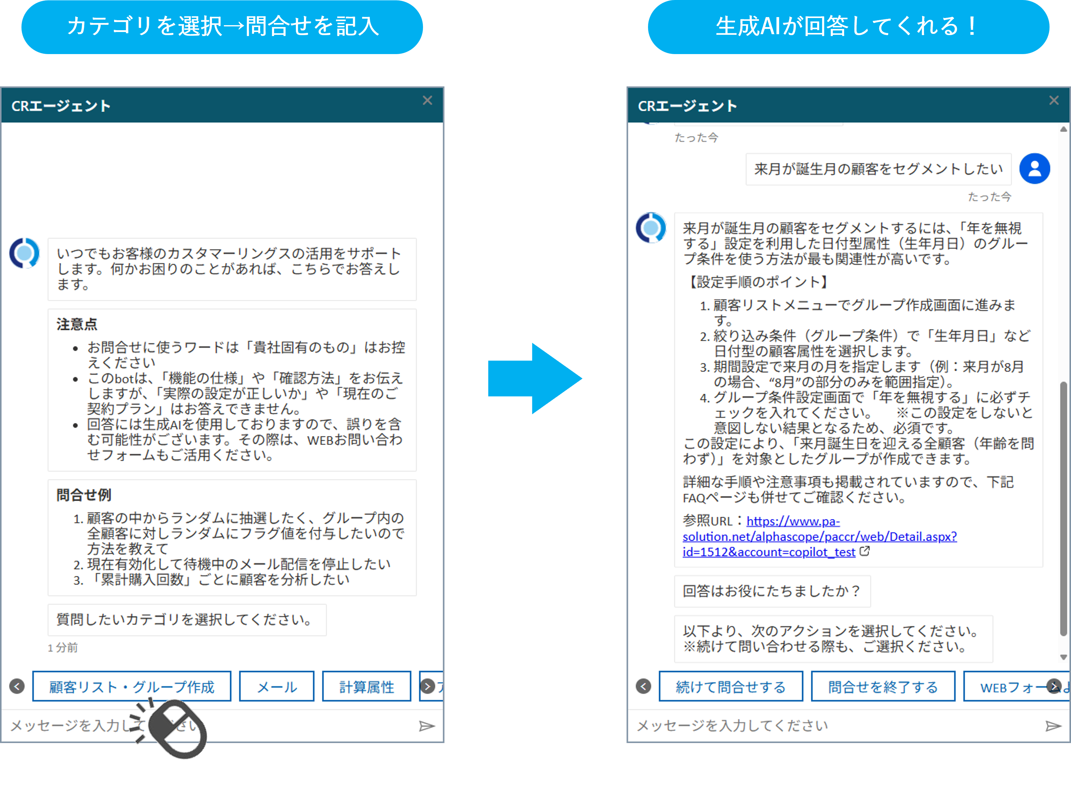 案内に沿ってチャット画面にお問合せを入力すると、生成AIが回答を提供します。